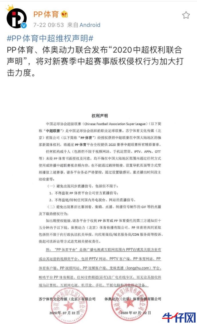 7月22日,PP體育、體奧動力聯(lián)合發(fā)布“2020中超權(quán)利聯(lián)合聲明”:任何機構(gòu)或個人未經(jīng)PP體育書面授權(quán)及同意,均不得在中國大陸地區(qū)范圍內(nèi)通過任何方式使用或轉(zhuǎn)播中超聯(lián)賽視音頻內(nèi)容,也不能通過跳轉(zhuǎn)鏈接、設(shè)置導(dǎo)航頁面等方式變相播放上述賽事。如出現(xiàn)侵權(quán)行為,體奧動力、PP體育將共同采取包括但不限于向行政執(zhí)法機關(guān)舉報、向應(yīng)用商店/域名服務(wù)商/CDN服務(wù)商等投訴、提起司法訴訟等方式追究相關(guān)侵權(quán)責(zé)任。