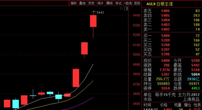 “本周銀價突破20美元整關后加速向上,擴大戰果,截止22日亞市午盤,紐約白銀連續合約最高至23.19美元/盎司,周內累計上漲超3美元/盎司,三日漲幅超15%。國內滬銀期貨和金交所白銀現貨延期合約雙雙封死漲停板,白銀現貨普遍漲超400元/千克,銀價站上5000元大關,創七年來新高。”談及近日貴金屬價格走勢,卓創分析師張偉稱。
