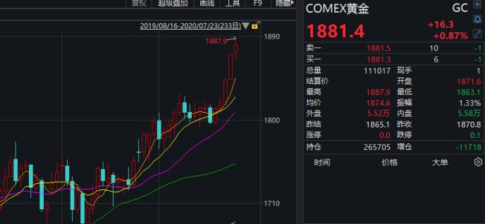 7月23日,紐約黃金、白銀盤中一度現沖高后小幅回調,然國內期貨市場上,滬銀主力合約漲勢依然強勁。