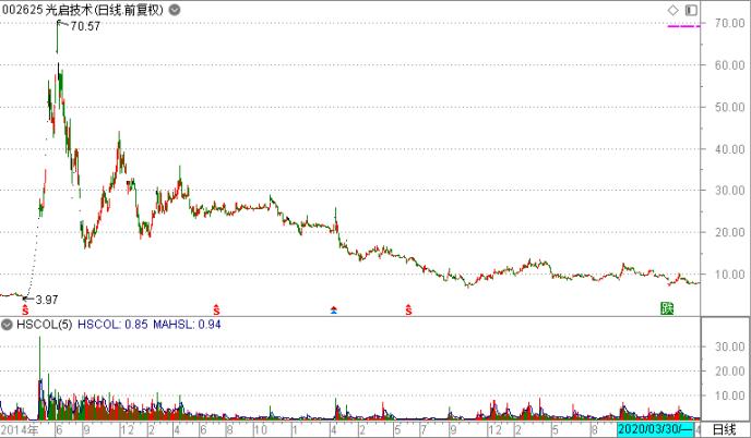 光啟技術(shù)在上波牛市之中,從4元(前復(fù)權(quán))附近起步,最高漲到了70元,然后又最低跌到了6元附近。