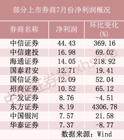 環(huán)比看來,多數(shù)券商凈利潤有不同程度的增長,包括東方證券(行情600958,診股)、中銀證券(行情601696,診股)、天風(fēng)證券(行情601162,診股)等在內(nèi)的15家券商7月凈利潤增長幅度超過100%。