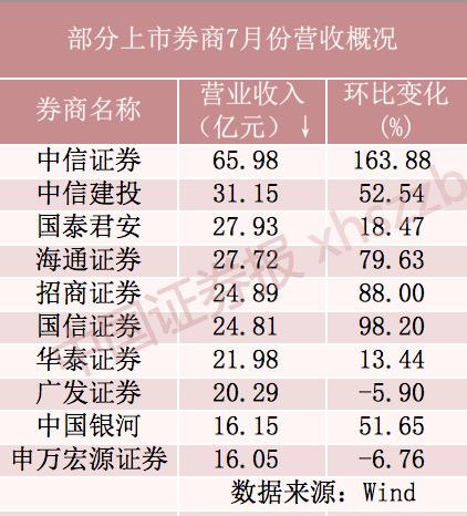 從營收看,35家上市券商7月份合計實現(xiàn)營收429.71億元,有13家上市券商營收超10億元。