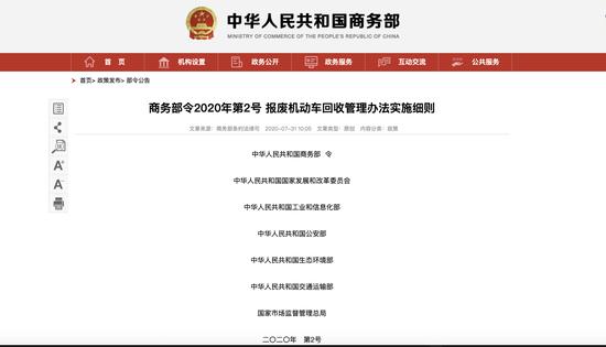 7月31日,商務部正式發布《報廢機動車回收管理辦法實施細則》。根據《實施細則》顯示,國家鼓勵報廢機動車回收拆解行業市場化、專業化、集約化發展,推動完善報廢機動車回收利用體系,提高回收利用效率和服務水平。