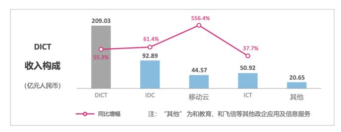 2020年上半年,中國移動的政企市場收入達到了552.04億元,同比增長18.4%,在中國移動CHBN“四輪”市場中收入同比變化表現最佳,其中DICT市場收入達到209億元,同比增長55.3%。在DICT中,IDC、移動云和ICT均獲得了較大幅度的增長。