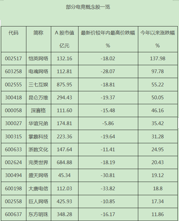 從行情數(shù)據(jù)來看,今年以來,17只電競概念股年內(nèi)平均漲幅為31%,大幅跑贏大盤(同期漲幅10.29%)。其中,愷英網(wǎng)絡(luò)、電魂網(wǎng)絡(luò)漲幅位居前列,分別上漲137.98%、97.78%。