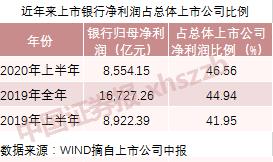 Wind數據顯示,36家上市銀行上半年共計實現凈利潤8554.15億元,占A股所有上市公司當期凈利潤比例為46.56%。目前A股上市銀行僅有36家,不足所有上市公司數量的1%。