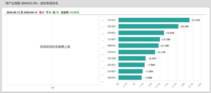 Wind數(shù)據(jù)顯示,雞產(chǎn)業(yè)指數(shù)上周(9月7日-9月11日)累計下跌9.33%,本月累計下跌12.12%,年初至今跌逾10%。