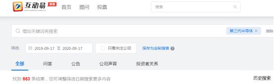 截至9月17日下午5時,證券時報·e公司記者從深交所互動易搜索看到,與第三代半導體相關的提問或回復已有663條。