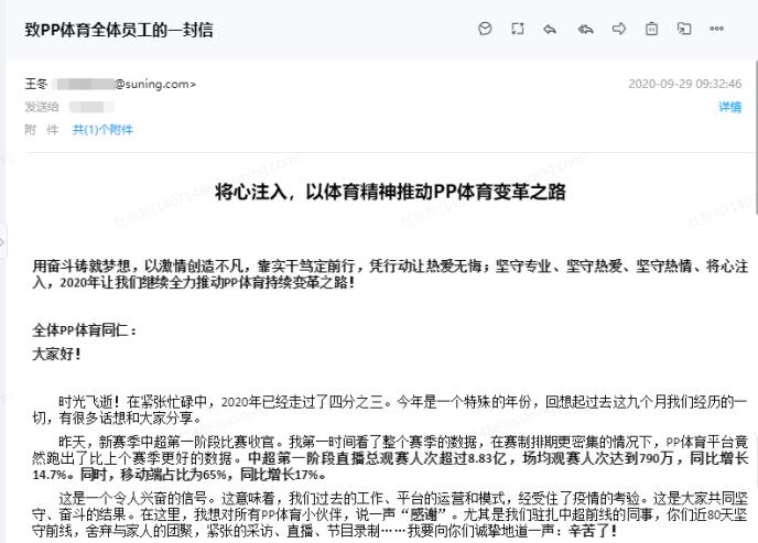“在賽制排期密集的情況下,PP體育平臺跑出了比上個賽季更好的數據。”從PP體育總裁王冬致全體員工的一封內部信中可以看出,其對這份運營成績的認可,并直言這是大家共同堅守、奮斗的結果,“尤其是駐扎中超前線的同事,近80天堅守前線,舍棄與家人的團聚,緊張的采訪、直播、節目錄制……我要向你們誠摯的道一聲:辛苦了。”