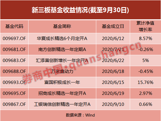 從新三板基金的收益看,自6月12日首只可投新三板基金成立以來(lái),截至目前共發(fā)行成立7只可投新三板的公募基金。截至9月30日,這些基金的業(yè)績(jī)出現(xiàn)分化,平均收益率4.6%,最高一只收益超過(guò)15%,同時(shí)有兩只基金收益非正,凈值出現(xiàn)了小幅下跌。