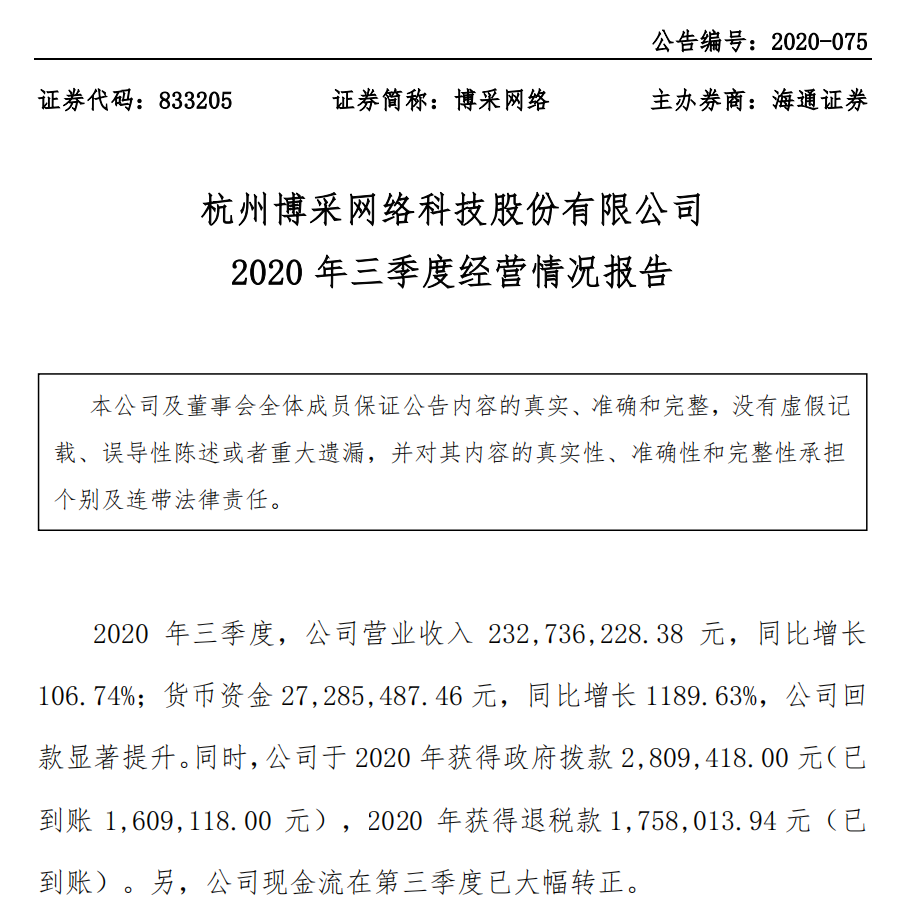 “十一”長(zhǎng)假結(jié)束后第一個(gè)交易日,博采網(wǎng)絡(luò)率先發(fā)布了2020年三季度經(jīng)營(yíng)情況報(bào)告。