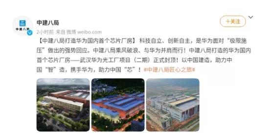 據中國建筑(行情601668,診股)第八工程局有限公司官網報道,近日,隨著最后一方混凝土澆筑完成,中建八局承建的華為國內首個芯片廠房——武漢華為光工廠項目(二期)正式封頂。