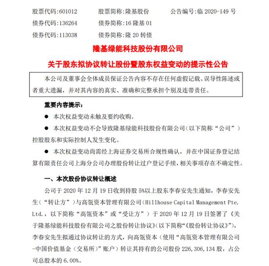 12月20日晚間,隆基股份(行情601012,診股)公告稱,公司股東李春安與高瓴資本于12月19日簽署了《股份轉(zhuǎn)讓協(xié)議》,李春安擬通過協(xié)議轉(zhuǎn)讓的方式,向高瓴資本轉(zhuǎn)讓其持有的公司股份2.26億股,占公司總股本的6.00%;本次交易對(duì)價(jià)總額為158.4億元。