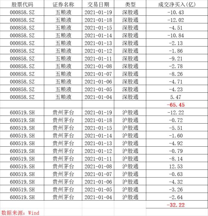 如果從1月以來(lái)的數(shù)據(jù)來(lái)看,北上資金幾乎是天天賣出茅臺(tái)和五糧液,累計(jì)凈賣出五糧液超65億元,累計(jì)凈賣出貴州茅臺(tái)超32億元,兩股合計(jì)被拋售近100億。