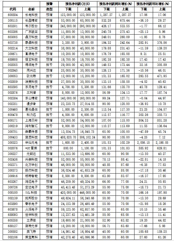 預增幅度上,長電科技(行情600584,診股)、長盈精密(行情300115,診股)、韋爾股份(行情603501,診股)、高德紅外(行情002414,診股)、天華超凈(行情300390,診股)、廣東駿亞(行情603386,診股)、晶方科技(行情603005,診股)、泰晶科技(行情603738,診股)、