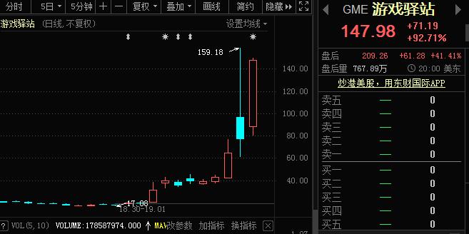 周二,美股游戲驛站收盤(pán)漲92.71%,報(bào)147.98美元,近9個(gè)交易日累計(jì)上漲逾640%,相較去年4月的地點(diǎn)2.57美元,9個(gè)月的時(shí)間里,股價(jià)已暴漲逾50倍。盤(pán)后交易繼續(xù)大漲逾40%。
