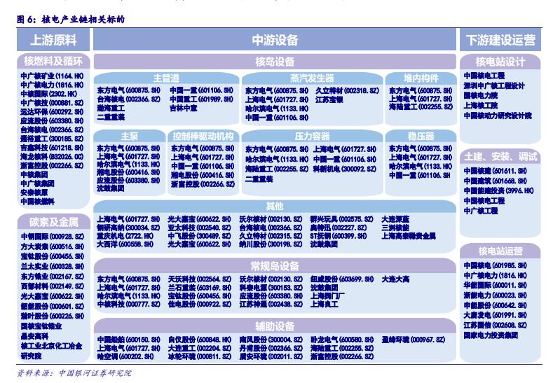 核電產業鏈按照上中下游來劃分,可分為上游鈾礦開采加工、燃料元件制造及核燃料循環,源于安全性考量,核電產業鏈上游、下游基本由國企壟斷;中游設備制造環節精細多樣、技術壁壘高、附加值大,由國企主導,細分領域民企活躍,市場關注度高。(來源銀河證券研報)