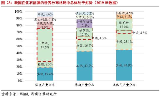 從化石能源的產量分布來看,煤炭、石油、天然氣的頭部集中效應非常顯著,總體上我國缺少優勢,美國、俄羅斯、中東國家具有較大優勢。2019年煤碳產量中國約占世界47.6%,優勢較為明顯。原油產量前五的國家美國、俄羅斯、沙特、加拿大、伊拉克占世界產量比重超過五成,而我國僅有4.3%。天然氣產量分布中美國、俄羅斯優勢明顯,我國僅占4.5%。