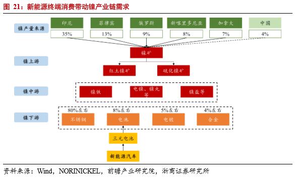 鎳及其產業鏈的需求將受新能源電池的普及推動。中國鎳下游需求分布中,新能源相關的行業為電池行業,占比為8%,主要來源于新能源汽車產業鏈中的三元電池對硫酸鎳的需求,預計未來隨著新能源汽車的普及和快速發展,鎳的下游需求中電池消費占比將會大幅提升,帶動鎳的需求大幅增強。