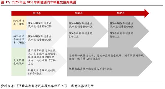 未來新能源汽車有望呈現出跨越式增長。2020年10月,由工業和信息化部、中國汽車工程學會編制的《節能與新能源汽車技術路線圖2.0》(下稱“路線圖2.0”)正式發布。首先,路線圖指出,新能源汽車的車型做包括純電動汽車(BEV)、插電式混合動力汽車(PHEV)和氫氣燃料電磁汽車;其次,對不同的車型,路線圖也做出了預測,對于BEV和PHEV,2025年、2030年與2035年兩類車型年銷量占汽車總銷量有望分別達到15%-25%、30%-40%、50-60%,對于氫氣燃料電磁車,2025年運行車輛或達到10萬輛,2035-2035年間保有量有望達到100萬量左右,均將實現跨越式增長。此外,中汽協發布的《新能源汽車產業發展規劃》也對新能源汽車銷量做出了預測,規劃指出“至2025年,我國新能源汽車占新車總銷量占比20%”的目標推算,2025年,我國新能源汽車銷量便有望達到600萬輛。