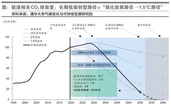 華泰證券認為,上述四種路徑面臨的兩難在于:一方面,長期執行“政策路徑”或“強化政策路徑”無法實現《巴黎協定》2050年最低溫升要求,也無法實現碳中和承諾;另一方面,如果減排路徑直接向2℃或1.5℃路徑靠攏,由于能源與體系的慣性以及經濟穩增長的需要,執行可行性低。因此,清華大學氣候研究院建議的“長期低碳轉型”路徑是上述基礎路徑的疊加:2030年前執行“強化政策路徑”,其后加速向“1.5℃路徑”靠攏。在“長期低碳轉型”路徑下,中國將于2050年基本實現二氧化碳凈零排放,于2060年實現全部溫室氣體凈零排放(碳中和)。因此,碳中和承諾實質上并非2060年才得以驗證的“遠期支票”,要兌現這一承諾,2030年前中國需要看到二氧化碳排放量拐點出現。